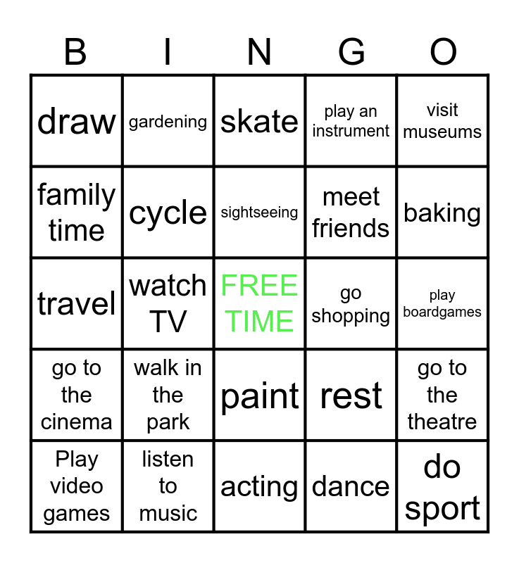 This bingo card has a free space and 29 words: Play video games, Jump rope, watch TV, read a book, draw, skate, cycle, walk in the park, go shopping, listen to music, play boardgames, do sport, acting, dance, baking, color, paint, go to the cinema, visit museums, travel, rest, eat out, meet friends, family time, play an instrument, gardening, go to the theatre, sightseeing and sleep.