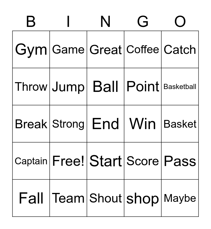 This bingo card has 25 words: Free!, Shout, Ball, Fall, Catch, Gym, Throw, Game, Win, Start, Point, Break, Score, Pass, Jump, Maybe, Basket, Great, Basketball, Strong, End, Team, Captain, Coffee and shop.
