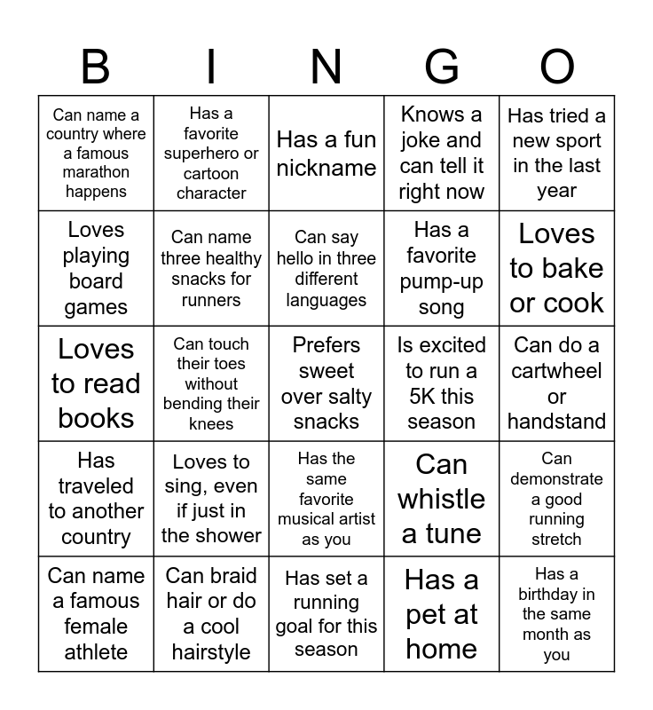 This bingo card has 26 words: Has the same favorite musical artist as you, Has a pet at home, Can say hello in three different languages, Can braid hair or do a cool hairstyle, Has tried a new sport in the last year, Can name a country where a famous marathon happens, Loves playing board games, Has a favorite superhero or cartoon character, Can do a cartwheel or handstand, Can whistle a tune, Has a favorite pump-up song, Loves to read books, Can demonstrate a good running stretch, Can name a famous female athlete, Can touch their toes without bending their knees, Has done yoga or stretching, Knows a joke and can tell it right now, Has traveled to another country, Has a fun nickname, Prefers sweet over salty snacks, Loves to bake or cook, Has set a running goal for this season, Is excited to run a 5K this season, Loves to sing, even if just in the shower, Can name three healthy snacks for runners and Has a birthday in the same month as you.