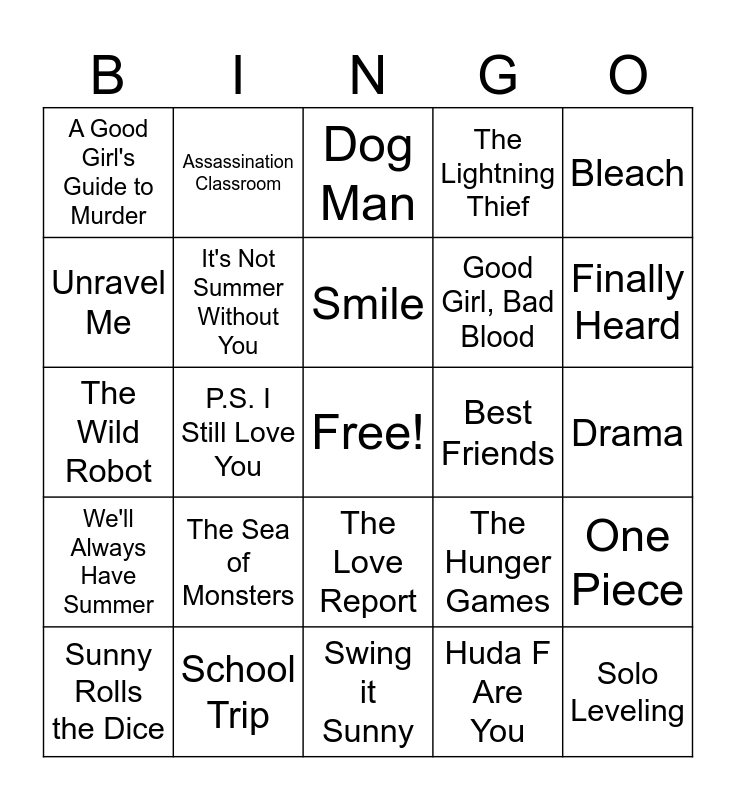 This bingo card has a free space and 36 words: JuJustsu Kaisen, The Baby-Sitters Club Graphic Novels, To All the Boys I've Loved Before, It's Not Summer Without You, The Hunger Games, We'll Always Have Summer, Smile, Ghosts, Bleach, Diary of a Wimpy Kid, P.S. I Still Love You, The Lightning Thief, Allergic, Best Friends, Finally Heard, A Good Girl's Guide to Murder, The Maze Runner, The Sea of Monsters, Solo Leveling, Dog Man, Drama, One Piece, School Trip, Sunny Rolls the Dice, Swing it Sunny, Assassination Classroom, The Wild Robot, Demon Slayer, Good Girl, Bad Blood, Unravel Me, Komi Can't Communicate, The Squad, Huda F Are You, The Love Report, True Beauty and JuJustsu Kaisen, The Baby-Sitters Club Graphic Novels, To All the Boys I've Loved Before, It's Not Summer Without You, The Hunger Games, We'll Always Have Summer, Smile, Ghosts, Bleach, Diary of a Wimpy Kid, The Lightning Thief, Allergic, Best F.