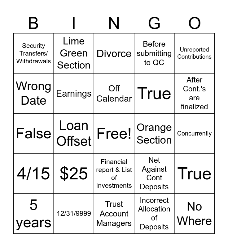 This bingo card has a free space and 24 words: $25, 12/31/9999, Off Calendar, 5 years, Unreported Contributions, Security Transfers/ Withdrawals, Wrong Date, Lime Green Section, Orange Section, Financial report & List of Investments, True, False, Net Against Cont Deposits, True, Earnings, Incorrect Allocation of Deposits, Concurrently, Divorce, After Cont.'s are finalized, Loan Offset, No Where, 4/15, Before submitting to QC and Trust Account Managers.