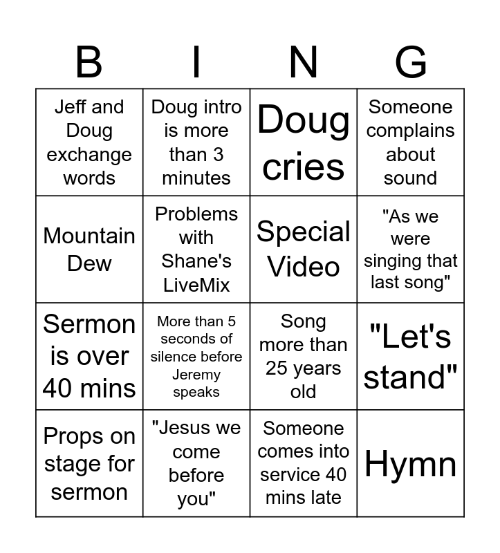 This bingo card has 16 words: "Jesus we come before you", "Let's stand", Doug cries, Jeff and Doug exchange words, Sermon is over 40 mins, Doug intro is more than 3 minutes, Song more than 25 years old, Someone comes into service 40 mins late, Mountain Dew, Problems with Shane's LiveMix, Props on stage for sermon, Someone complains about sound, More than 5 seconds of silence before Jeremy speaks, "As we were singing that last song", Special Video and Hymn.