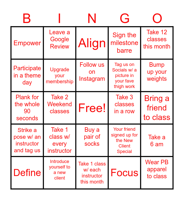 This bingo card has a free space and 24 words: Take 1 class w/ every instructor, Introduce yourself to a new client, Follow us on Instagram, Define, Take 12 classes this month, Empower, Participate in a theme day, Leave a Google Review, Take 3 classes in a row, Buy a pair of socks, Tag us on Socials w/ a picture in your fave thigh work, Plank for the whole 90 seconds, Your friend signed up for the New Client Special, Take a 6 am, Upgrade your membership, Focus, Bring a friend to class, Align, Bump up your weights, Take 2 Weekend classes, Wear PB apparel to class, Strike a pose w/ an instructor and tag us, Sign the milestone barre and Take 1 class w/ each instructor this month.