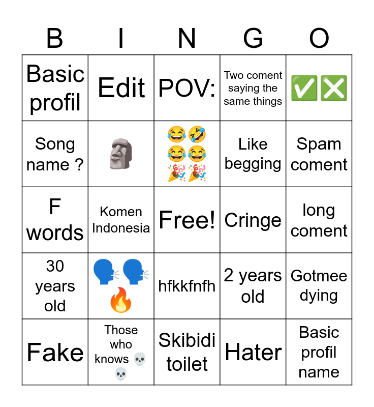 This bingo card has a free space and 24 words: 🗣️🗣️🔥, Those who knows 💀💀, 😂🤣😂😂🎉🎉, Fake, ✅❎, Basic profil, Song name ?, Edit, Cringe, hfkkfnfh, Like begging, F words, 2 years old, Gotmee dying, 🗿, Hater, long coment, POV:, Spam coment, Komen Indonesia, Basic profil name, 30 years old, Two coment saying the same things and Skibidi toilet.