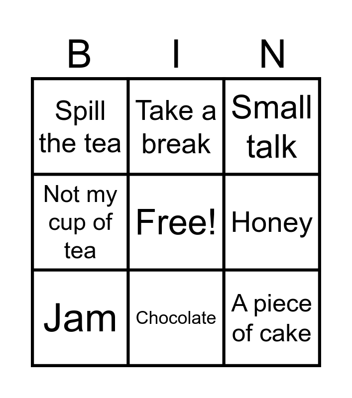 This bingo card has a free space and 15 words: Clotted cream, Tea, Small talk, Spill the tea, Chocolate, A piece of cake, Cheers!, Biscuit or cookie?, Honey, Restaurant, Croissant, Not my cup of tea, Jam, Take a break and Sandwich.