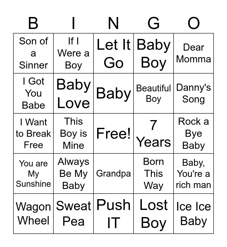 This bingo card has a free space and 46 words: Three Little Birds, Ice Ice Baby, Baby Got Back, Push IT, Always Be My Baby, Baby One More Time, If I Were a Boy, Sweet Child O' Mine, I Got You Babe, Can't Get Enough of You Babe, Baby Love, Baby Boy, Baby, You're a rich man, Born This Way, Heaven, All of Me, Baby, 7 Years, Pretty Boy Swag, Dear Momma, This Boy is Mine, Lost Boy, Son of a Sinner, Beautiful Boy, Wild Things, Danny's Song, Wagon Wheel, Can't Take My Eyes Off You, Grandpa, You are My Sunshine, Baby Shark, We Are Family, Build Me Up Buttercup, Haven't Met You Yet, Never Grow Up, Sweat Pea, Rock a Bye Baby, Leave, Closing Time, Under Pressure, I'm Coming Out, Let It Go, I Want to Break Free, Here Comes the Sun, Whoomp, There It Is and My Boo.