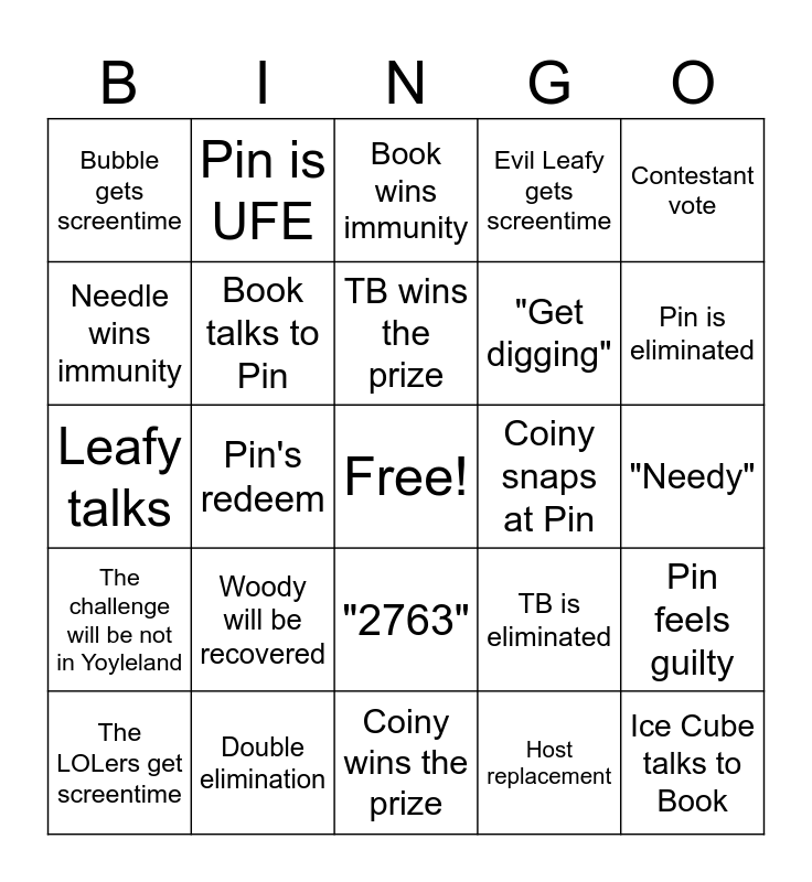 This bingo card has a free space and 24 words: Woody will be recovered, Double elimination, TB wins the prize, The LOLers get screentime, Contestant vote, Bubble gets screentime, Needle wins immunity, Pin is UFE, Coiny snaps at Pin, "2763", "Get digging", Leafy talks, TB is eliminated, Pin feels guilty, Book talks to Pin, Host replacement, "Needy", Book wins immunity, Pin is eliminated, Pin's redeem, Ice Cube talks to Book, The challenge will be not in Yoyleland, Evil Leafy gets screentime and Coiny wins the prize.