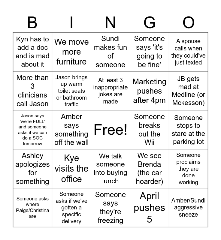 This bingo card has a free space and 24 words: Kye visits the office, Someone asks if we've gotten a specific delivery, At least 3 inappropriate jokes are made, Someone asks where Paige/Christina are, A spouse calls when they could've just texted, Kyn has to add a doc and is mad about it, More than 3 clinicians call Jason, We move more furniture, Someone breaks out the Wii, We talk someone into buying lunch, Marketing pushes after 4pm, Jason says 'we're FULL' and someone asks if we can do a SOC tomorrow, We see Brenda (the car hoarder), Someone proclaims they are done working, Jason brings up warm toilet seats or bathroom traffic, April pushes 5, Someone stops to stare at the parking lot, Sundi makes fun of someone, JB gets mad at Medline (or Mckesson), Amber says something off the wall, Amber/Sundi aggressive sneeze, Ashley apologizes for something, Someone says 'it's going to be fine' and Someone says they're freezing.