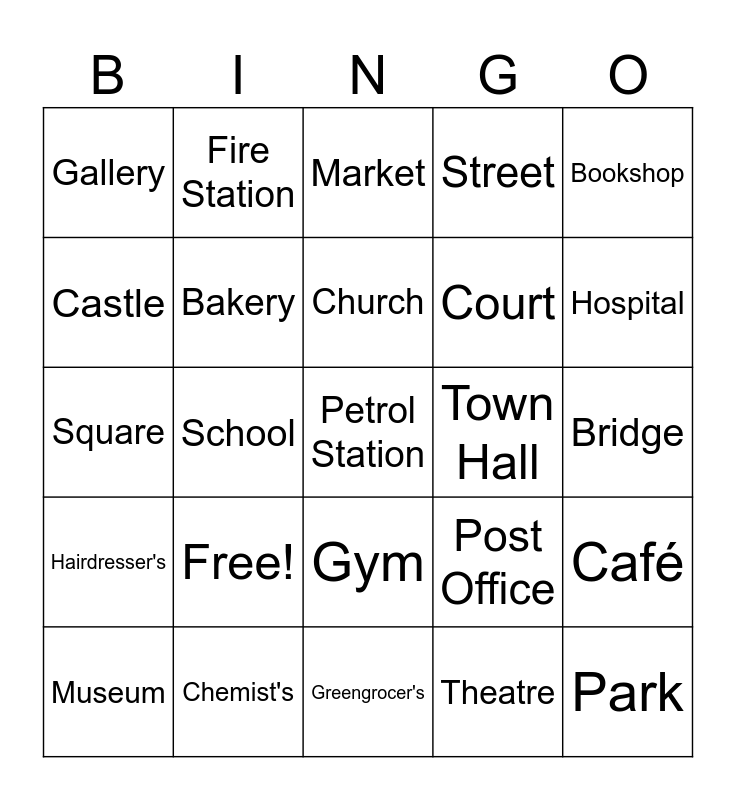 This bingo card has 25 words: Free!, Greengrocer's, Church, Museum, Bookshop, Gallery, Castle, Fire Station, Town Hall, Gym, Court, Square, Post Office, Café, Bakery, Park, Bridge, Market, Hospital, School, Petrol Station, Chemist's, Hairdresser's, Street and Theatre.