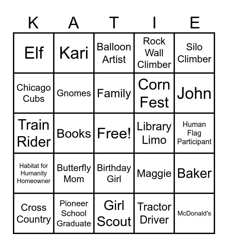 This bingo card has a free space and 44 words: Games, McDonald's, State Farm, Cross Country, Stilt Walker, Tractor Driver, Balloon Artist, Home Improvement Aficionado, Silo Climber, Pioneer School Graduate, Rock Wall Climber, Library Limo, Birthday Girl, Butterfly Mom, Camper, Girl Scout, Bocce Ball Player, Train Rider, Bumper Boat Driver, John, Kari, Holiday Spectacular, University High School Graduate, Elf, Speed Driver, Human Flag Participant, Sophie, Six: The Musical, Maggie, Habitat for Humanity Homeowner, Christmas Lover, Baker, Parents, Towanda Fourth of July, Books, Girl's Trip, Harry Potter, Lilly, Family, Chicago Cubs, Corn Fest, Ugly Christmas Sweaters, Gnomes and Patrick Mahomes.