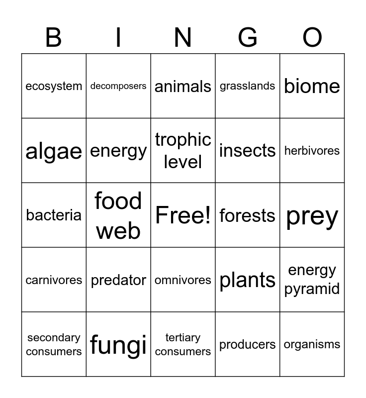 This bingo card has a free space and 34 words: temporal, producers, tropical, consumers, carnivores, energy, biome, secondary consumers, decomposers, habitat, trophic level, animals, aquatic, primary consumers, forests, herbivores, fungi, bacteria, predator, plants, omnivores, sun, ecosystem, prey, tertiary consumers, organisms, grasslands, jungles, insects, algae, food chain, food web, energy pyramid and biodiversity.
