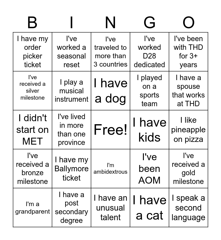 This bingo card has a free space and 24 words: I have my Ballymore ticket, I have a post secondary degree, I have a dog, I'm a grandparent, I've been with THD for 3+ years, I have my order picker ticket, I've received a silver milestone, I've worked a seasonal reset, I have kids, I'm ambidextrous, I played on a sports team, I didn't start on MET, I've been AOM, I've received a gold milestone, I play a musical instrument, I have a cat, I like pineapple on pizza, I've traveled to more than 3 countries, I have a spouse that works at THD, I've lived in more than one province, I speak a second language, I've received a bronze milestone, I've worked D28 dedicated and I have an unusual talent.
