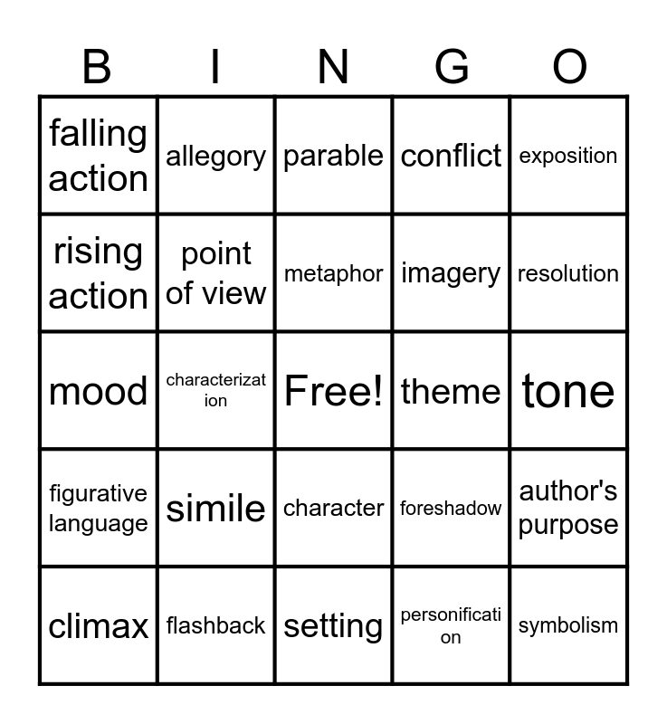 This bingo card has a free space and 24 words: simile, flashback, metaphor, climax, exposition, falling action, rising action, allegory, theme, character, imagery, mood, foreshadow, author's purpose, point of view, personificati on, tone, parable, resolution, characterizat ion, symbolism, figurative language, conflict and setting.