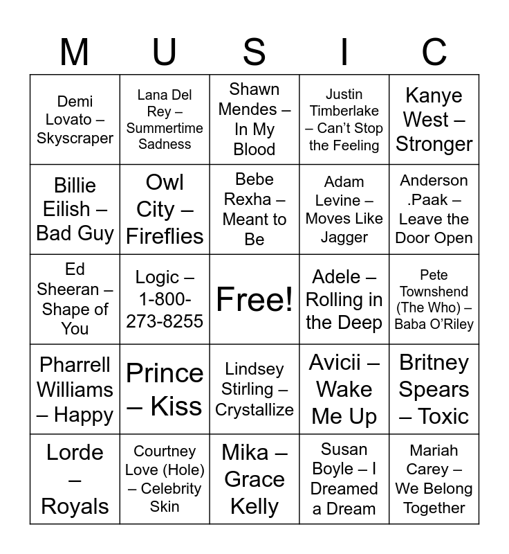 This bingo card has a free space and 60 words: David Byrne – Burning Down the House, Courtney Love (Hole) – Celebrity Skin, Sia – Chandelier, Pharrell Williams – Happy, Susan Boyle – I Dreamed a Dream, James Durbin – Love Me Bad, Owl City – Fireflies, Will.i.am – Boom Boom Pow, Adam Levine – Moves Like Jagger, Melanie Martinez – Dollhouse, Justin Timberlake – Can’t Stop the Feeling, Solange – Losing You, Billie Eilish – Bad Guy, Mozart – Eine kleine Nachtmusik, Halsey – Without Me, Demi Lovato – Skyscraper, Mariah Carey – We Belong Together, Kanye West – Stronger, Sinéad O’Connor – Nothing Compares 2 U, Bebe Rexha – Meant to Be, Adele – Rolling in the Deep, Shawn Mendes – In My Blood, Lorde – Royals, Britney Spears – Toxic, Zayn Malik – PILLOWTALK, Cher – Believe, Tom Cruise – Danger Zone, Keira Knightley – Tell Me If You Wanna Go Home, Anderson .Paak – Leave the Door Open, Nirvana – Smells Like Teen Spirit, Joey Ramone – Blitzkrieg Bop, Travis Scott – SICKO MODE, Florence Welch – Shake It Out, Nicki Minaj – Super Bass, Lana Del Rey – Summertime Sadness, Kid Cudi – Pursuit of Happiness, Fiona Apple – Criminal, Logic – 1-800-273-8255, Mac Miller – Good News, Ed Sheeran – Shape of You, Thom Yorke (Radiohead) – Creep, Prince – Kiss, Pete Townshend (The Who) – Baba O’Riley, Alanis Morissette – Ironic, Avicii – Wake Me Up, Jack Antonoff (Bleachers) – Don’t Take the Money, Tame Impala – The Less I Know the Better, Frank Ocean – Thinkin Bout You, Jamie Grace – Hold Me, Lindsey Stirling – Crystallize, Mika – Grace Kelly, Megan Washington – Holy Moses, Syd Barrett (Pink Floyd) – See Emily Play, Gary Numan – Cars, Ian Curtis (Joy Division) – Love Will Tear Us Apart, Hans Zimmer – Time (Inception Soundtrack), Yungblud – Parents, Kesha – Praying, Jason Mraz – I’m Yours and Norah Jones – Don’t Know Why.