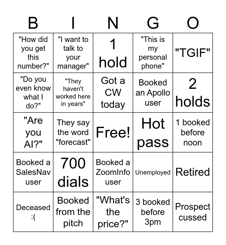This bingo card has a free space and 24 words: 700 dials, Booked from the pitch, Got a CW today, Deceased :(, "TGIF", "How did you get this number?", "Do you even know what I do?", "I want to talk to your manager", Hot pass, Booked a ZoomInfo user, Booked an Apollo user, "Are you AI?", Unemployed, Retired, "They haven't worked here in years", 3 booked before 3pm, 1 booked before noon, 1 hold, 2 holds, They say the word "forecast", Prospect cussed, Booked a SalesNav user, "This is my personal phone" and "What's the price?".