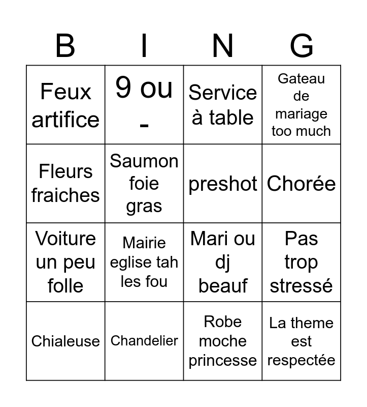 This bingo card has 16 words: Chandelier, Pas trop stressé, Service à table, Feux artifice, Voiture un peu folle, 9 ou -, Mari ou dj beauf, Robe moche princesse, Fleurs fraiches, Saumon foie gras, Chialeuse, Gateau de mariage too much, Mairie eglise tah les fou, Chorée, preshot and La theme est respectée.