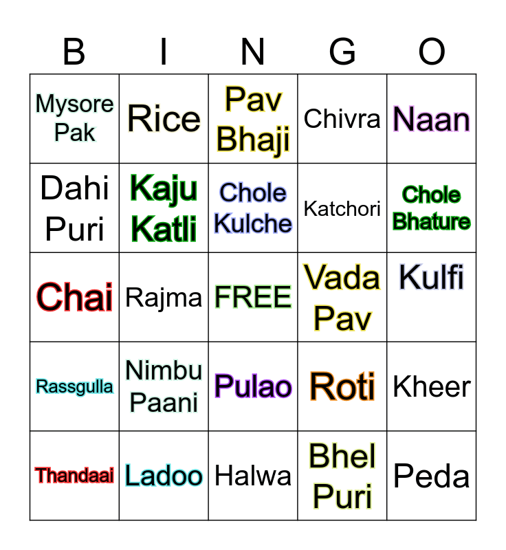This bingo card has a free space and 34 words: Papdi Chaat, Bhel Puri, Sev Puri, Gulab Jamun, Rassgulla, Kaju Katli, Naan, Thandaai, Rice, Pani Puri, Chole Kulche, Pav Bhaji, Biryani, Palak Paneer, Vada Pav, Chole Bhature, Ladoo, Chai, Nimbu Paani, Roti, Pulao, Dabelli, Mysore Pak, Kulfi, Halwa, Peda, Chivra, Samosa, Katchori, Dahi Puri, Panneer Tikka, Rajma, Kheer and Lassi.