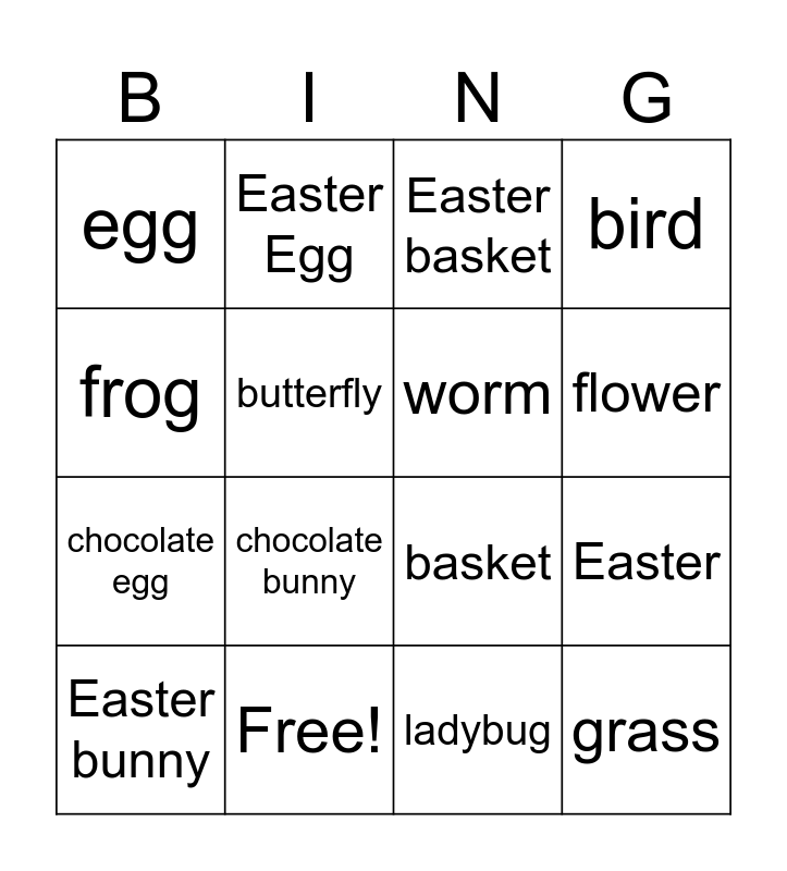 This bingo card has 16 words: Free!, Easter, Easter basket, egg, chocolate egg, Easter Egg, basket, ladybug, frog, butterfly, Easter bunny, bird, chocolate bunny, flower, worm and grass.