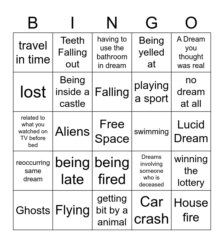 This bingo card has a free space and 27 words: -Being chased, Flying, Falling, Car crash, A Dream you thought was real, lost, Teeth Falling out, getting bit by a animal, swimming, winning the lottery, reoccurring same dream, Being inside a castle, Dreams involving someone who is deceased, House fire, related to what you watched on TV before bed, Dream gave you good or bad feelings upon waking, having to use the bathroom in dream, Being yelled at, Lucid Dream, travel in time, being late, being fired, playing a sport, no dream at all, Ghosts, Aliens and Failing a test.