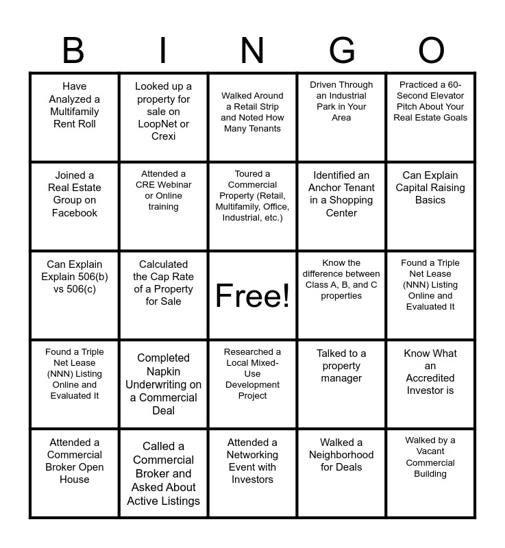 This bingo card has a free space and 24 words: Completed Napkin Underwriting on a Commercial Deal, Called a Commercial Broker and Asked About Active Listings, Toured a Commercial Property (Retail, Multifamily, Office, Industrial, etc.), Attended a Commercial Broker Open House, Practiced a 60-Second Elevator Pitch About Your Real Estate Goals, Have Analyzed a Multifamily Rent Roll, Joined a Real Estate Group on Facebook, Looked up a property for sale on LoopNet or Crexi, Know the difference between Class A, B, and C properties, Researched a Local Mixed-Use Development Project, Identified an Anchor Tenant in a Shopping Center, Can Explain Explain 506(b) vs 506(c), Talked to a property manager, Know What an Accredited Investor is, Attended a CRE Webinar or Online training, Walked a Neighborhood for Deals, Found a Triple Net Lease (NNN) Listing Online and Evaluated It, Walked Around a Retail Strip and Noted How Many Tenants, Can Explain Capital Raising Basics, Calculated the Cap Rate of a Property for Sale, Walked by a Vacant Commercial Building, Found a Triple Net Lease (NNN) Listing Online and Evaluated It, Driven Through an Industrial Park in Your Area and Attended a Networking Event with Investors.