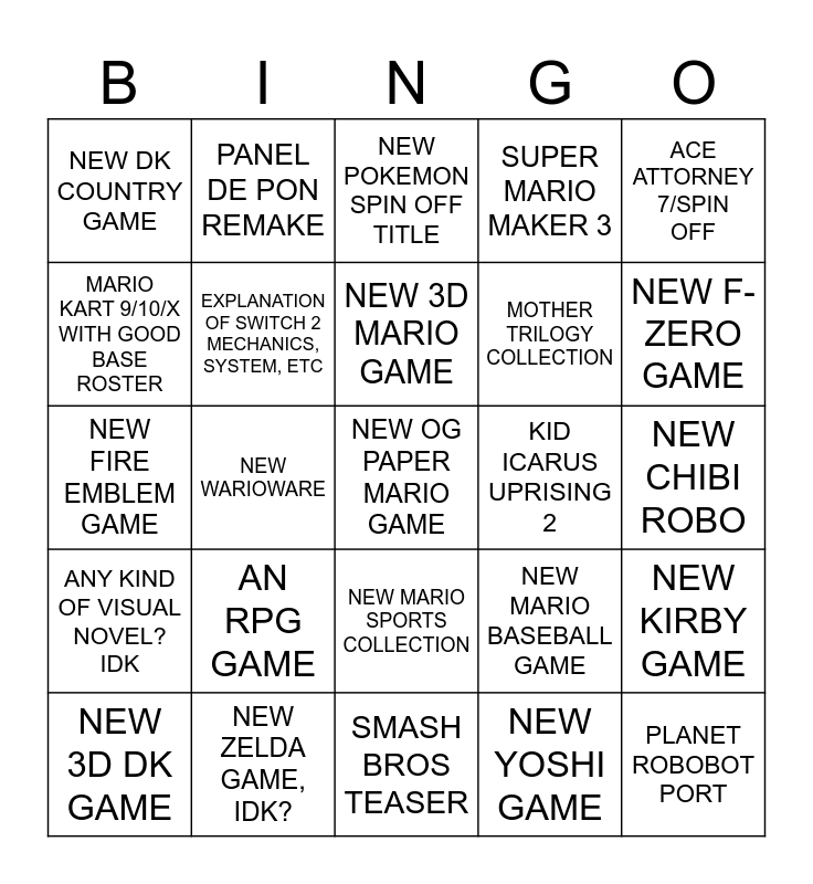 This bingo card has 25 words: AN RPG GAME, SMASH BROS TEASER, NEW 3D MARIO GAME, NEW 3D DK GAME, ACE ATTORNEY 7/SPIN OFF, NEW DK COUNTRY GAME, MARIO KART 9/10/X WITH GOOD BASE ROSTER, PANEL DE PON REMAKE, KID ICARUS UPRISING 2, NEW MARIO SPORTS COLLECTION, MOTHER TRILOGY COLLECTION, NEW FIRE EMBLEM GAME, NEW MARIO BASEBALL GAME, NEW KIRBY GAME, EXPLANATION OF SWITCH 2 MECHANICS, SYSTEM, ETC, PLANET ROBOBOT PORT, NEW CHIBI ROBO, NEW POKEMON SPIN OFF TITLE, NEW F-ZERO GAME, NEW WARIOWARE, NEW OG PAPER MARIO GAME, NEW ZELDA GAME, IDK?, ANY KIND OF VISUAL NOVEL? IDK, SUPER MARIO MAKER 3 and NEW YOSHI GAME.