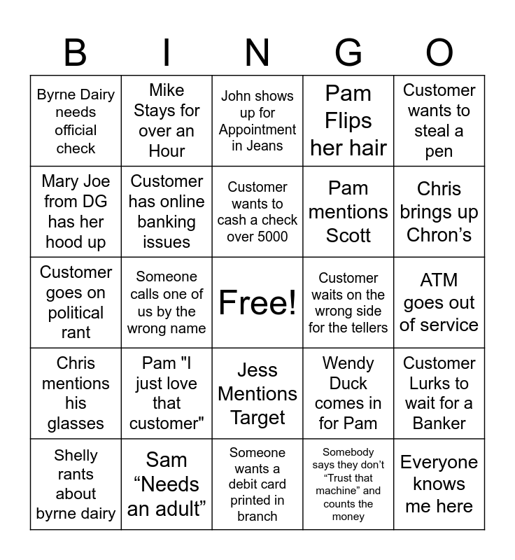 This bingo card has a free space and 84 words: These are nice Pens, Customer says "You're all alone here?", John shows up for Appointment in Jeans, Customer has Colored Hair, Customer wearing Shorts, Customer wearing sunglasses, New Customer, Customer admits to stealing pens, Customer sits down to count their cash, Somebody comments on the music, Terri Lowe doesnt show, Terri Lowe gets a nasty comment about mortgages, Customer has online banking issues, Customer waits on the wrong side for the tellers, Bald Customer, Byrne Dairy needs official check, Shelly rants about byrne dairy, Mary Joe from DG has her hood up, Customer brings up Michelle(Not Daryle), Customer says " I got my pick of people today", Jess talks to someone like their mother by yelling their name, Pam mentions Scott, Everyone knows me here, “Why Do I need ID”, Someone calls one of us by the wrong name, Mark says "Hey Buddy", Ron texts Jess after he leaves, Chris talks about the roman empire, Chris says how much he like/loves hunter, Jess talks about divorce, Pam "I just love that customer", Customer calls and whoever answers doesn't get their name, Sam confuses Jess and Pam, Customer goes on political rant, Someone says Pam is the manager, Someone needs a Money Order, Someone wants a debit card printed in branch, Jennifer Thorpe hands us a deposit and immediately leaves, Chris brings up Chron’s, Chris mentions his glasses, Jess cackles, TCR has under 10K in Hundreds, Customer mentions the Weather, Customer claims they don't know how they over drafted when they did it to themselves, Customer says they have fraud but they did the transaction once you talk to them about it, Ron comes in and goes directly to Jess's Office, Mike Stays for over an Hour, Customer says they dont know anyone, anymore, Ricky Thorpe makes sarcastic comment to Pam, Daryle sits down to talk in an office, Harry Hits the Buzzer, Wendy Duck comes in for Pam, Pam Flips her hair, Jess says her tummy hurts, Chris makes a B-line for the back, Sam mentions that he can’t talk today, Sam “Needs an adult”, Customer wants to cash a check over 5000, Chris goes on a rant about a random topic for no reason, ATM goes out of service, Customer needs a new Debit Card, Notary is asked for, Paula from Kinney’s does the dots, Card Stuck in ATM, Jess asks for a Celsius, Bic isn’t ran until after 3, Adult takes a Lollipop, Safe Deposit Box, Customer wants to steal a pen, Pam talks about her dad, Customer Lurks to wait for a Banker, Sam Wears Boots, Jess gets Sam and Chris confused, Jess’s mother-in-law calls, Jess Mentions Target, Somebody says they don’t “Trust that machine” and counts the money, Group Argument, Jess plays the same ABBA songs, Hunter calls Jess, Pam threatens the underwriters, Jess sends someone else for food, Jess mentions her kids, Customer hits on employee and Customer comments on Sam & Chris being similar.
