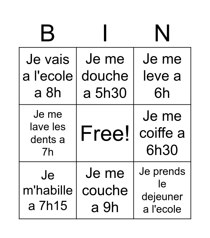 This bingo card has a free space and 8 words: Je me coiffe a 6h30, Je me leve a 6h, Je me douche a 5h30, Je m'habille a 7h15, Je vais a l'ecole a 8h, Je prends le dejeuner a l'ecole, Je me lave les dents a 7h and Je me couche a 9h.