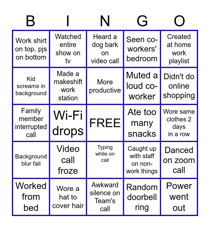 This bingo card has a free space and 29 words: Worked from bed, Sorry, I had connection issues, Wi-Fi drops, Virtual happy hour, Work shirt on top, pjs on bottom, Heard a dog bark on video call, Made a makeshift work station, Video call froze, Ate too many snacks, Wore a hat to cover hair, Wore same clothes 2 days in a row, Power went out, Awkward silence on Team's call, Random doorbell ring, Didn't do online shopping, Stood up at least once an hour, Typing while on call, Background blur fail, Created at home work playlist, Family member interrupted call, Caught up with staff on non-work things, Customized a virtual background, Muted a loud co-worker, Kid screams in background, Seen co-workers' bedroom, Watched entire show on tv, Danced on zoom call, More productive and Tidy up home.
