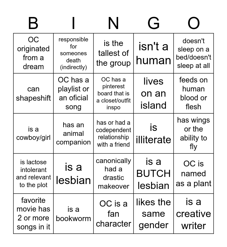 This bingo card has a free space and 24 words: is a lesbian, is a bookworm, OC has a pinterest board that is a closet/outfit inspo, favorite movie has 2 or more songs in it, doesn't sleep on a bed/doesn't sleep at all, OC originated from a dream, can shapeshift, responsible for someones death (indirectly), is illiterate, canonically had a drastic makeover, lives on an island, is a cowboy/girl, is a BUTCH lesbian, OC is named as a plant, OC has a playlist or an oficial song, likes the same gender, has wings or the ability to fly, is the tallest of the group, feeds on human blood or flesh, has an animal companion, is a creative writer, is lactose intolerant and relevant to the plot, isn't a human and OC is a fan character.