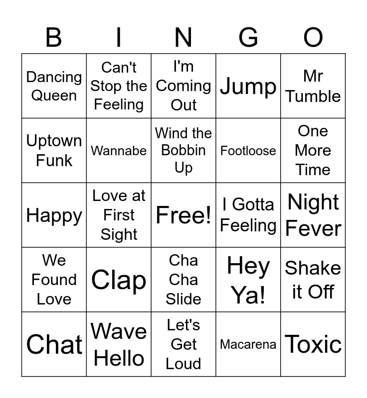 This bingo card has a free space and 24 words: Clap, Wave Hello, Wind the Bobbin Up, Chat, Mr Tumble, Dancing Queen, Uptown Funk, Can't Stop the Feeling, I Gotta Feeling, Cha Cha Slide, Footloose, Happy, Hey Ya!, Shake it Off, Wannabe, Macarena, Night Fever, I'm Coming Out, One More Time, Love at First Sight, Toxic, We Found Love, Jump and Let's Get Loud.