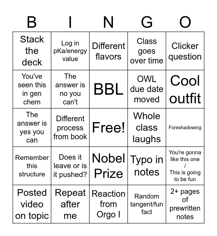 This bingo card has a free space and 24 words: Does it leave or is it pushed?, Repeat after me, BBL, Posted video on topic, Clicker question, Stack the deck, You've seen this in gen chem, Log in pKa/energy value, Whole class laughs, Nobel Prize, OWL due date moved, The answer is yes you can, Typo in notes, You're gonna like this one / This is going to be fun, The answer is no you can't, Random tangent/fun fact, Foreshadowing, Different flavors, Cool outfit, Different process from book, 2+ pages of prewritten notes, Remember this structure, Class goes over time and Reaction from Orgo I.