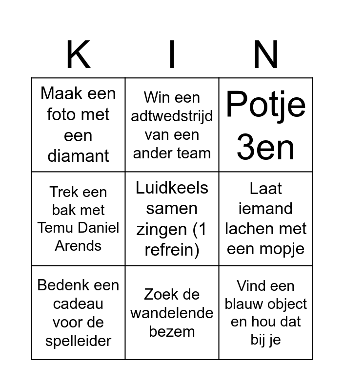 This bingo card has 20 words: Trek samen een bak, Potje mexxen, Potje 3en, Wissel een kledingstuk, Bedenk een liedje en zing die voor de rest, Luidkeels samen zingen (1 refrein), Win een potje steen, papier, bak, Maak een foto met een diamant, Vind een blauw object en hou dat bij je, Win een adtwedstrijd van een ander team, Bedenk een cadeau voor Beurd, Trek een bak met een uniek ingredient (zorg dat niemand anders dat gebruikt), Laat iemand lachen met een mopje, Drink een bier zonder je handen te gebruiken, Bedenk een cadeau voor de spelleider, Strik jullie schoenveters aan elkaar vast, Zoek de wandelende bezem, Trek een bak met Temu Daniel Arends, Samen hinkelend over het dakterras heen and Maak jezelf vast aan een ander team.