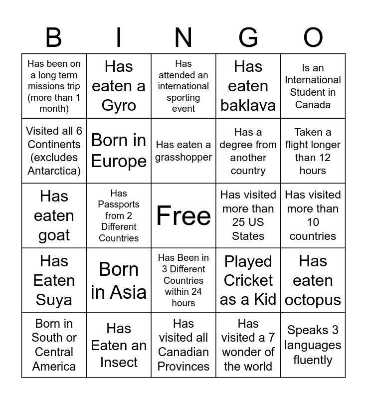 This bingo card has a free space and 29 words: Born in South or Central America, Born in Africa, Has Passports from 2 Different Countries, Has eaten Adobo, Has been on a long term missions trip (more than 1 month), Has attended an international sporting event, Born in Europe, Born in Asia, Has visited more than 25 US States, Has Eaten an Insect, Has visited more than 10 countries, Speaks 3 languages fluently, Has visited all Canadian Provinces, Has visited a 7 wonder of the world, Taken a flight longer than 12 hours, Has eaten Fufu, Has Been in 3 Different Countries within 24 hours, Has Eaten Suya, Is an International Student in Canada, Has eaten goat, Played Cricket as a Kid, Has eaten Okonomiyaki, Has a degree from another country, Visited all 6 Continents (excludes Antarctica), Has eaten baklava, Has eaten a Gyro, Has eaten octopus, Has eaten a grasshopper and Has helped children in other countries.