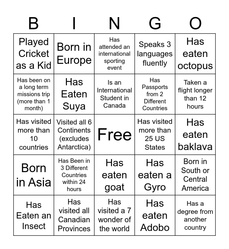This bingo card has a free space and 28 words: Born in South or Central America, Born in Africa, Has Passports from 2 Different Countries, Has eaten Adobo, Has been on a long term missions trip (more than 1 month), Has attended an international sporting event, Born in Europe, Born in Asia, Has visited more than 25 US States, Has Eaten an Insect, Has visited more than 10 countries, Speaks 3 languages fluently, Has visited all Canadian Provinces, Has visited a 7 wonder of the world, Taken a flight longer than 12 hours, Has eaten Fufu, Has Been in 3 Different Countries within 24 hours, Has Eaten Suya, Is an International Student in Canada, Has eaten goat, Played Cricket as a Kid, Has eaten Okonomiyaki, Has a degree from another country, Visited all 6 Continents (excludes Antarctica), Has eaten baklava, Has eaten a Gyro, Has eaten octopus and Has eaten a grasshopper.