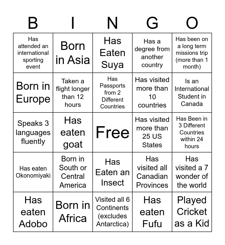 This bingo card has a free space and 24 words: Born in South or Central America, Born in Africa, Has Passports from 2 Different Countries, Has eaten Adobo, Has been on a long term missions trip (more than 1 month), Has attended an international sporting event, Born in Europe, Born in Asia, Has visited more than 25 US States, Has Eaten an Insect, Has visited more than 10 countries, Speaks 3 languages fluently, Has visited all Canadian Provinces, Has visited a 7 wonder of the world, Taken a flight longer than 12 hours, Has eaten Fufu, Has Been in 3 Different Countries within 24 hours, Has Eaten Suya, Is an International Student in Canada, Has eaten goat, Played Cricket as a Kid, Has eaten Okonomiyaki, Has a degree from another country and Visited all 6 Continents (excludes Antarctica).