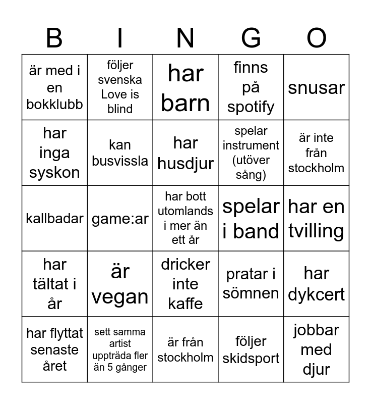 This bingo card has 25 words: är vegan, är från stockholm, har husdjur, har flyttat senaste året, snusar, är med i en bokklubb, har inga syskon, följer svenska Love is blind, spelar i band, dricker inte kaffe, spelar instrument (utöver sång), kallbadar, pratar i sömnen, har dykcert, kan busvissla, jobbar med djur, har en tvilling, har barn, är inte från stockholm, game:ar, har bott utomlands i mer än ett år, sett samma artist uppträda fler än 5 gånger, har tältat i år, finns på spotify and följer skidsport.