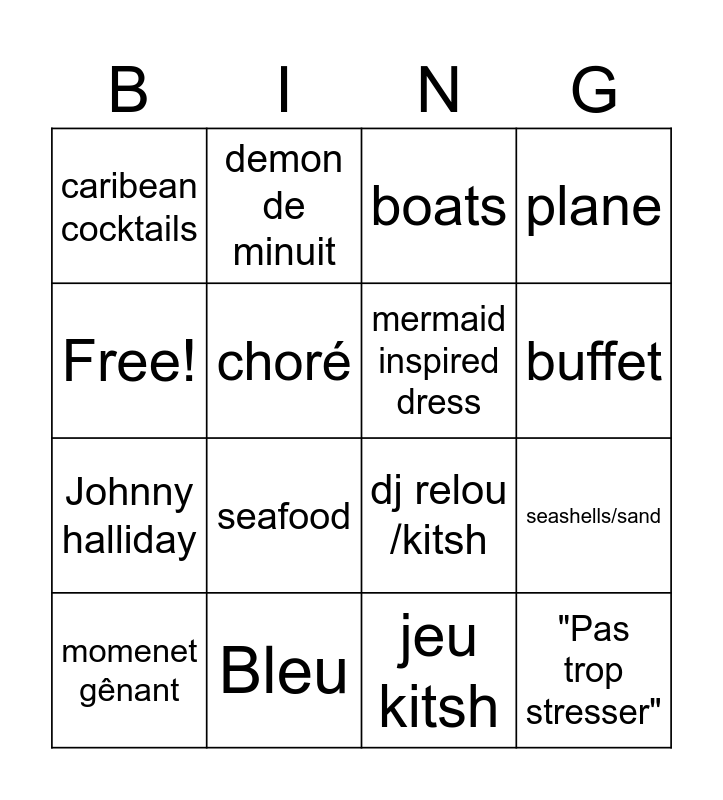 This bingo card has 16 words: Bleu, seashells/sand, boats, caribean cocktails, Johnny halliday, demon de minuit, dj relou /kitsh, jeu kitsh, Free!, choré, momenet gênant, plane, seafood, buffet, mermaid inspired dress and "Pas trop stresser".