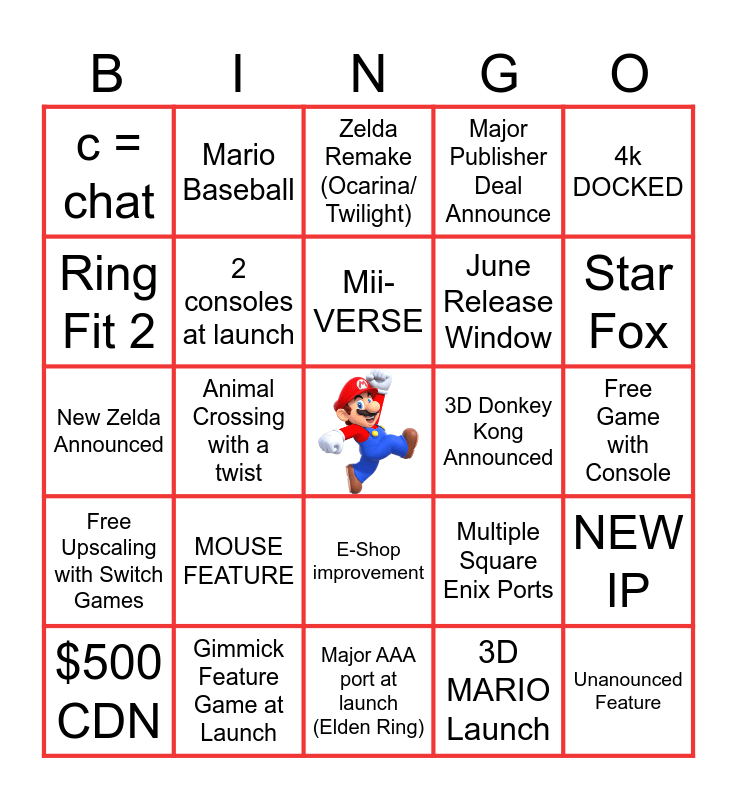This bingo card has a free space and 24 words: $500 CDN, MOUSE FEATURE, Mii-VERSE, 3D MARIO Launch, 4k DOCKED, c = chat, Mario Baseball, Zelda Remake (Ocarina/ Twilight), 3D Donkey Kong Announced, Free Game with Console, New Zelda Announced, 2 consoles at launch, Multiple Square Enix Ports, NEW IP, Ring Fit 2, Gimmick Feature Game at Launch, Major AAA port at launch (Elden Ring), Major Publisher Deal Announce, Star Fox, Free Upscaling with Switch Games, Animal Crossing with a twist, E-Shop improvement, June Release Window and Unanounced Feature.