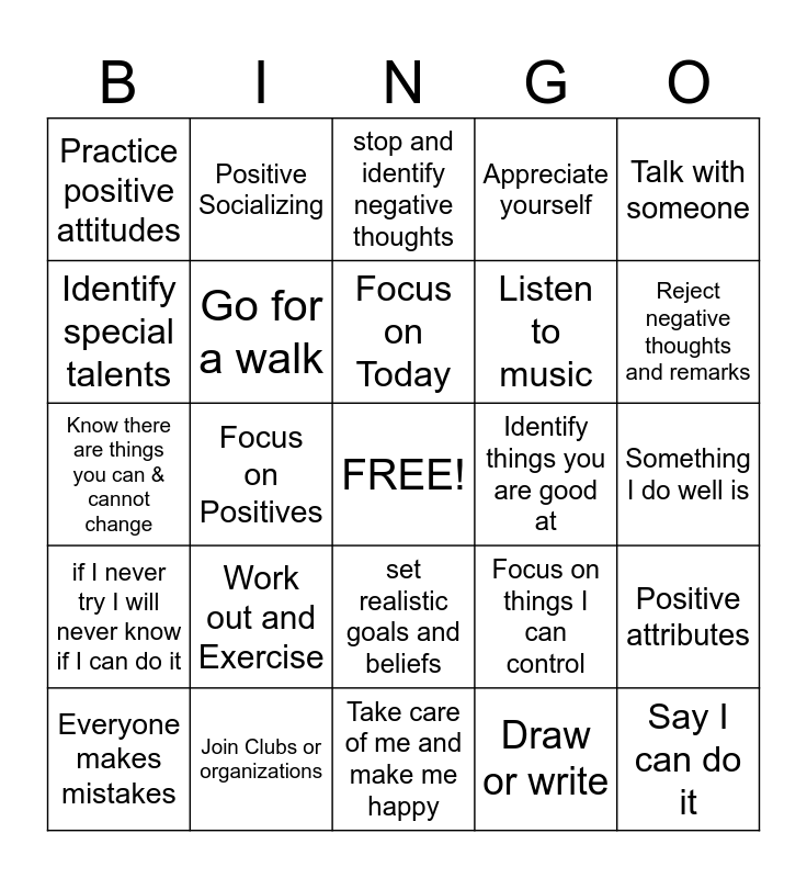 This bingo card has a free space and 24 words: Work out and Exercise, Join Clubs or organizations, Focus on Today, Everyone makes mistakes, Talk with someone, Practice positive attitudes, Identify special talents, Positive Socializing, Identify things you are good at, set realistic goals and beliefs, Listen to music, Know there are things you can & cannot change, Focus on things I can control, Positive attributes, Go for a walk, Draw or write, Something I do well is, stop and identify negative thoughts, Reject negative thoughts and remarks, Focus on Positives, Say I can do it, if I never try I will never know if I can do it, Appreciate yourself and Take care of me and make me happy.