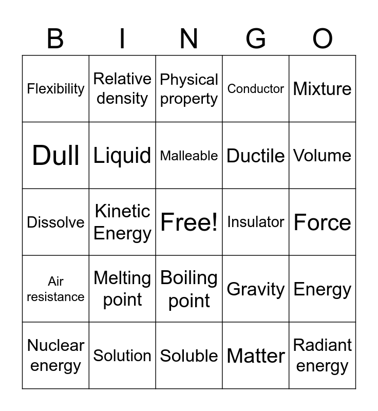 This bingo card has a free space and 43 words: Chemical energy, Radiant energy, Mechanical energy, Nuclear energy, Electrical energy, Matter, Physical property, Physical Change, Mixture, Solution, Conductor, Insulator, Boiling point, Melting point, Freezing point, Soluble, Solubility, Dissolve, Mass, Volume, Relative density, Texture, Magnetism, Flexibility, Thermal energy, Force, Motion, Friction, Gravity, Air resistance, Distance, Energy, Potential Energy, Kinetic Energy, Chemical Property, Chemical Change, Density, Malleable, Dull, Ductile, Gas, Liquid and Solid.