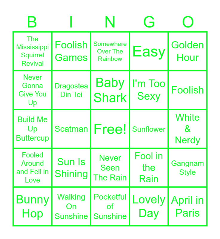 This bingo card has a free space and 44 words: April Come She Will, April in Paris, White Rabbit, Bunny Hop, April Showers, Lovely Day, Somewhere Over The Rainbow, Here Comes The Sun, Golden Hour, Walking On Sunshine, Easy, Sunflower, Never Seen The Rain, Sun Is Shining, Where The Skies Are Blue, Pocketful of Sunshine, Days Like This, Build Me Up Buttercup, Roses, Foolish, Foolish Games, Lovefool, Nobody's Fool, The Mississippi Squirrel Revival, Afternoon Delight, White & Nerdy, Fat, Scotty Doesn't Know, Fool in the Rain, Fooled Around and Fell in Love, Fool Hearted Memory, Gangnam Style, Friday, The Fox (What Does the Fox Say?), Scatman, Harlem Shake, Cotton Eye Joe, Axel F, Baby Shark, Never Gonna Give You Up, I'm Too Sexy, United States of Whatever, Dragostea Din Tei and Waterfalls.