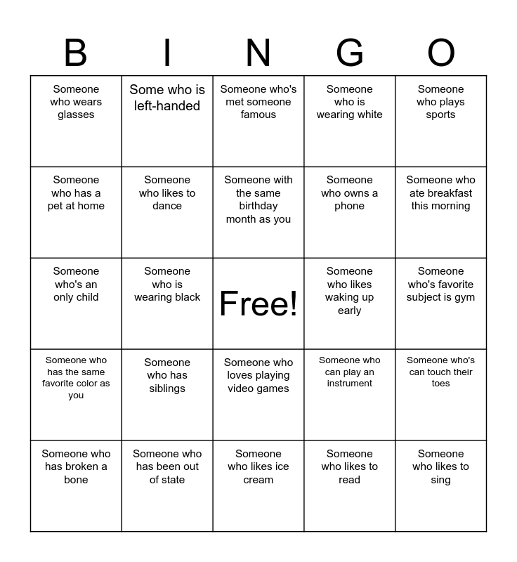 This bingo card has a free space and 24 words: Someone who has siblings, Someone who has been out of state, Someone with the same birthday month as you, Someone who has broken a bone, Someone who plays sports, Someone who wears glasses, Someone who has a pet at home, Some who is left-handed, Someone who likes waking up early, Someone who loves playing video games, Someone who owns a phone, Someone who's an only child, Someone who can play an instrument, Someone who's can touch their toes, Someone who likes to dance, Someone who likes to read, Someone who's favorite subject is gym, Someone who's met someone famous, Someone who ate breakfast this morning, Someone who is wearing black, Someone who likes to sing, Someone who has the same favorite color as you, Someone who is wearing white and Someone who likes ice cream.