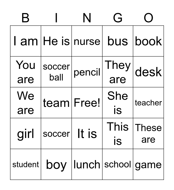 This bingo card has a free space and 24 words: soccer, boy, pencil, student, book, I am, You are, He is, She is, It is, They are, We are, This is, These are, soccer ball, school, teacher, nurse, desk, team, game, girl, bus and lunch.