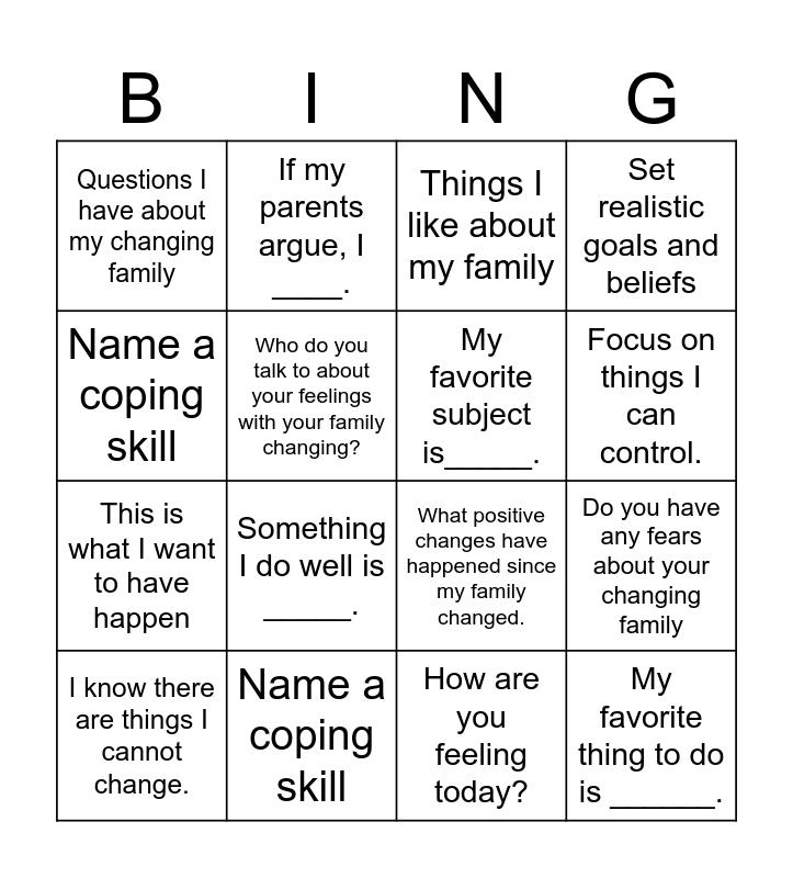 This bingo card has 16 words: Name a coping skill, Do you have any fears about your changing family, Things I like about my family, Questions I have about my changing family, This is what I want to have happen, If my parents argue, I ____., What positive changes have happened since my family changed., How are you feeling today?, Name a coping skill, Who do you talk to about your feelings with your family changing?, I know there are things I cannot change., Set realistic goals and beliefs, Something I do well is _____., Focus on things I can control., My favorite subject is_____. and My favorite thing to do is ______..