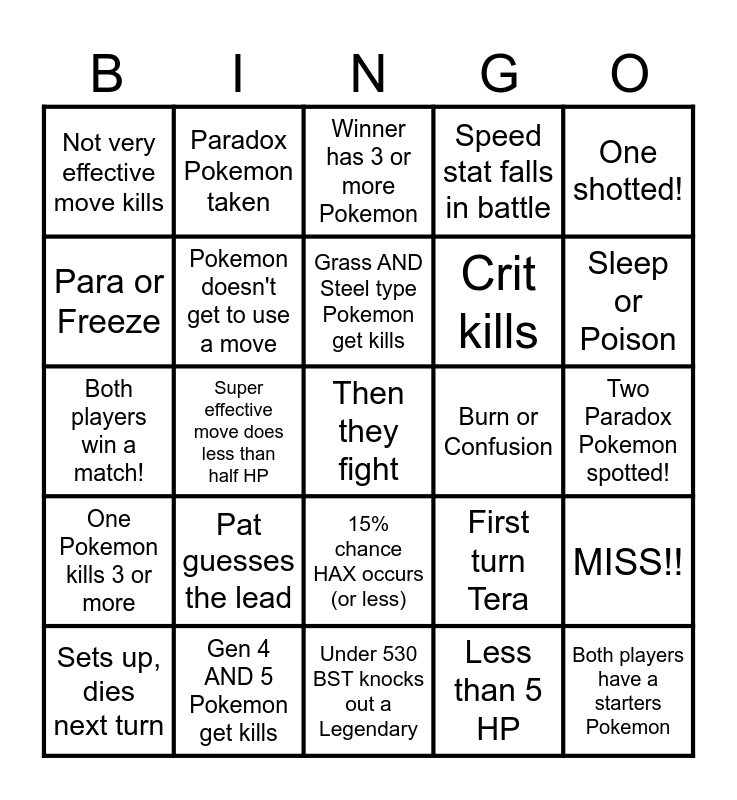 This bingo card has a free space and 24 words: Pat guesses the lead, Gen 4 AND 5 Pokemon get kills, Grass AND Steel type Pokemon get kills, Sets up, dies next turn, One shotted!, Not very effective move kills, Para or Freeze, Paradox Pokemon taken, Burn or Confusion, 15% chance HAX occurs (or less), Crit kills, Both players win a match!, First turn Tera, MISS!!, Pokemon doesn't get to use a move, Less than 5 HP, Two Paradox Pokemon spotted!, Winner has 3 or more Pokemon, Sleep or Poison, Super effective move does less than half HP, Both players have a starters Pokemon, One Pokemon kills 3 or more, Speed stat falls in battle and Under 530 BST knocks out a Legendary.