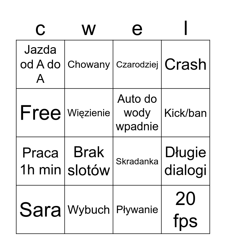 This bingo card has 16 words: Wybuch, Długie dialogi, Czarodziej, Jazda od A do A, Praca 1h min, Chowany, Skradanka, Pływanie, Free, Więzienie, Sara, Crash, Brak slotów, Kick/ban, Auto do wody wpadnie and 20 fps.
