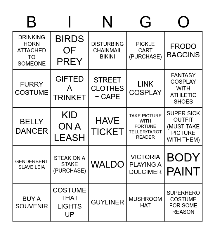 This bingo card has a free space and 24 words: STEAK ON A STAKE (PURCHASE), COSTUME THAT LIGHTS UP, STREET CLOTHES + CAPE, BUY A SOUVENIR, FRODO BAGGINS, DRINKING HORN ATTACHED TO SOMEONE, FURRY COSTUME, BIRDS OF PREY, TAKE PICTURE WITH FORTUNE TELLER/TAROT READER, WALDO, LINK COSPLAY, BELLY DANCER, VICTORIA PLAYING A DULCIMER, BODY PAINT, GIFTED A TRINKET, MUSHROOM HAT, SUPER SICK OUTFIT (MUST TAKE PICTURE WITH THEM), DISTURBING CHAINMAIL BIKINI, FANTASY COSPLAY WITH ATHLETIC SHOES, KID ON A LEASH, SUPERHERO COSTUME FOR SOME REASON, GENDERBENT SLAVE LEIA, PICKLE CART (PURCHASE) and GUYLINER.
