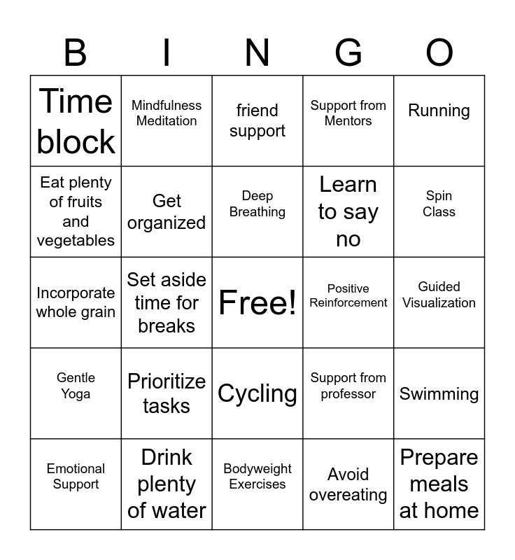This bingo card has a free space and 24 words: Prioritize tasks, Drink plenty of water, Deep Breathing, Emotional Support, Running, Time block, Eat plenty of fruits and vegetables, Mindfulness Meditation, Positive Reinforcement, Cycling, Learn to say no, Incorporate whole grain, Support from professor, Swimming, Get organized, Avoid overeating, Guided Visualization, friend support, Spin Class, Set aside time for breaks, Prepare meals at home, Gentle Yoga, Support from Mentors and Bodyweight Exercises.