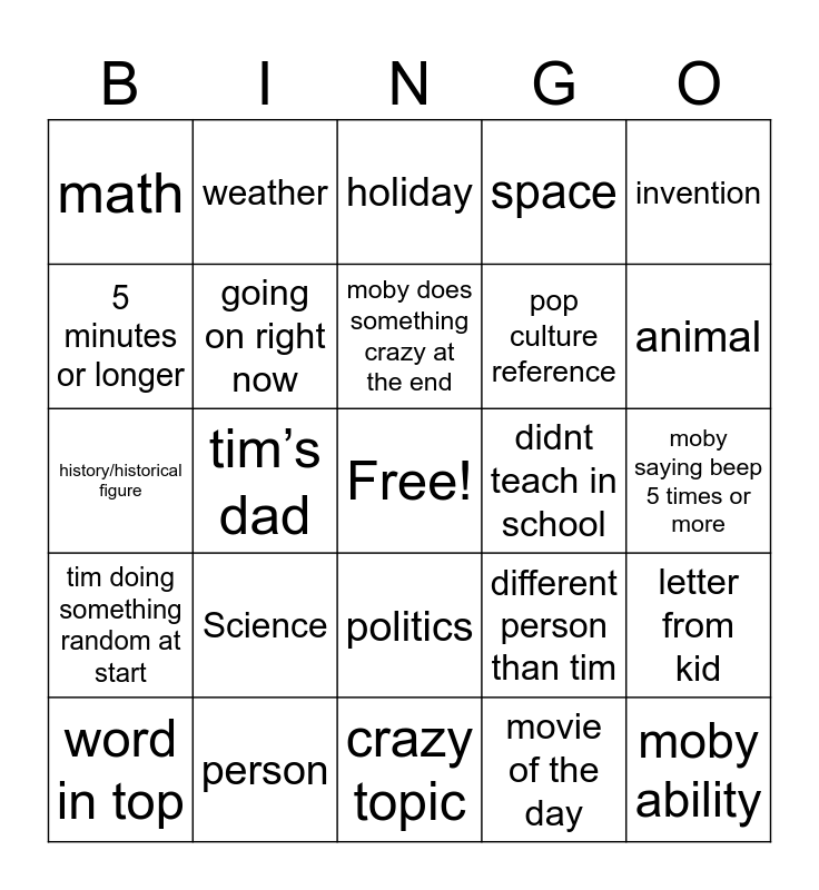 This bingo card has a free space and 24 words: Science, person, moby does something crazy at the end, word in top, invention, math, 5 minutes or longer, weather, didnt teach in school, politics, pop culture reference, history/historical figure, different person than tim, letter from kid, going on right now, movie of the day, moby saying beep 5 times or more, holiday, animal, tim’s dad, moby ability, tim doing something random at start, space and crazy topic.