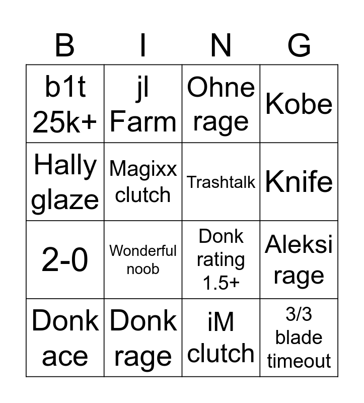 This bingo card has 16 words: Donk rage, Aleksi rage, Ohne rage, b1t 25k+, 2-0, jl Farm, Donk rating 1.5+, iM clutch, Hally glaze, Magixx clutch, Donk ace, Kobe, Wonderful noob, Knife, Trashtalk and 3/3 blade timeout.